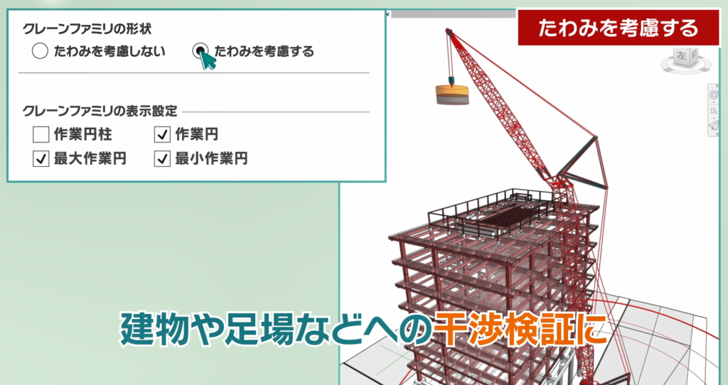 また、使いやすさにもこだわっており、「ソフトを直感的に扱えなければ、ユーザーから評価されませんし使ってもらえません。クレーンモデルは建物に対して、吊り能力に応じた姿勢を検討するシーンが多いため、これをマウスのクリックだけで検討できるように開発しました」と岡田氏。