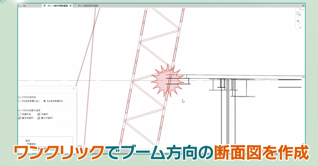 岡田氏も「建設業界では施工BIMが積極的に推進され始め、この機会に吊り能力に応じたクレーンの選定や配置提案もお客様にできると考えました。まずは、実際に施工計画を立てる側や、クレーンを活用する立場の人にヒアリングをして、何が必要な機能かを具体的に聞いて要件をまとめていったのです」と当時を振り返る。 クレーンに詳しい同社だが、BIMソフトのアドインの開発ノウハウはなかったという。そのような中、Archi Future 2018の展示会に来場者として訪れ、展示ブースで構造計画研究所に相談したことで、企画の実現が加速した。「2019年に開発を始め、その後はコロナ禍の状況下でもありましたが、提案を適宜受けながらスピーディーに進みました。我々も構造計画研究所も、ものづくりを行ってきた文化があるため、私たちの考えに共感いただけたのもポイントでした」と評価する。そして、簡単操作でファミリ動作ができ、施工計画に必要な情報やたわみ表示、タイムライン表示、断面図のチェックなど幅広い機能を備えたクレーンの施工シミュレーションを実現するソフトの開発に至ったのである。