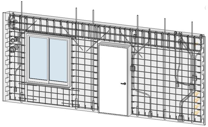 大成ユーレックではBIMソフトとしてRevitを導入しており、プラットフォームとして活用することとしたが、Revitの標準機能では、壁式PCa工法のサポートは用意されていない。そこで、Revit上でPC板のモデリング、板図作成を効率的に行うために必要となる機能を開発。PC板の板割情報と、意匠の壁・床や開口、設備スリーブや、電気配管などの情報を組み合わせ、PC板をモデル化することにした。プランに対応してPC板の割付を自動で行い、壁同士の接合部の種類や形状を決定。開口部や配管を設定すれば、PC板の中の配筋を自動生成するフローである。このとき、各要素で干渉が起こさず整合性を保つために、PC板の配筋を3Dモデルとして表現した。