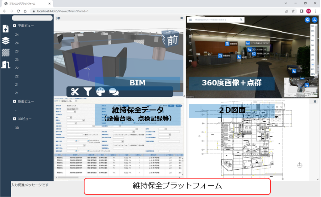 例えば既設の建物の場合、「360度画像+点群」で3D形状を表わすことができるため、BIMモデルを使用しないシステム構成は可能です。