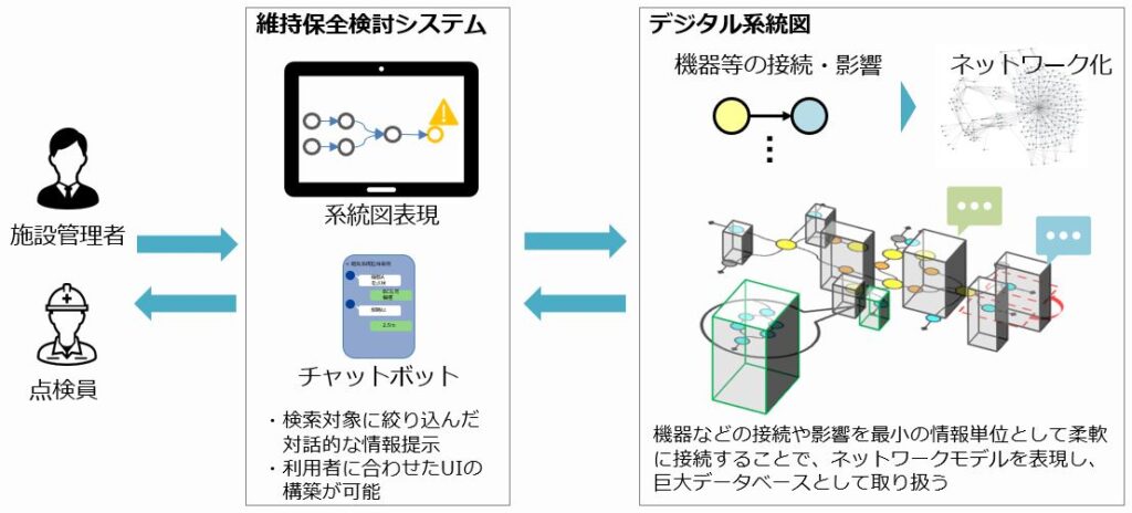 従来の設備インフラの運用・維持保全業務は、複雑な設備の系統構成のため、設備系統図や配置図など複数の図面を重ね合わせて情報を引き出す必要があり、大変煩雑な作業となっています。